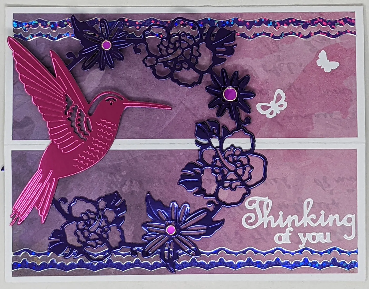 5. For the inside: Cut 6½"x4" Hummingbird blue floral vellum and glue it across the inside center, using tape runner adhesive along the upper and lower edges. Die cut another purple Mirri wreath, then cut the flowers apart. Use Sticky Specks™ to attach the flowers to fuchsia Mirri, then cut along the edges.