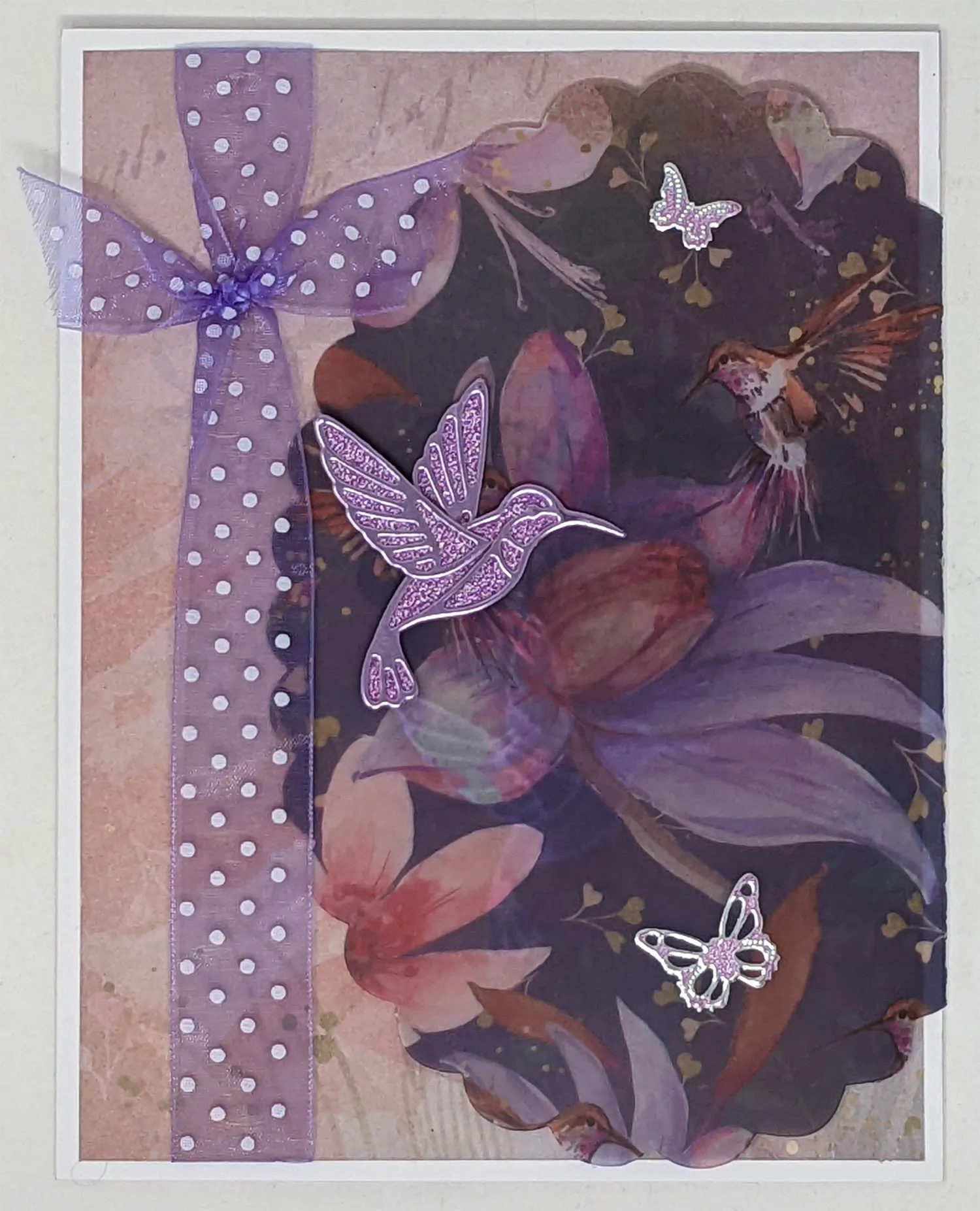 5. Close the flap and glue the second die cut hummingbird and place two smaller butterfly Dazzles™ on it as shown. Tie a 4" purple sheer dotted ribbon onto the first ribbon near the upper edge as shown and trim the ends.