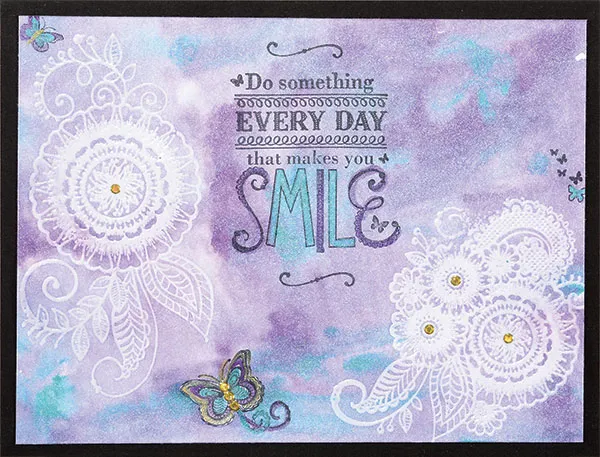 Stamp the sentiment in black ink. Stamp a few small butterflies in black around the resist images. Use a fine-tip paintbrush to color in a few of the small stamps with the Izink ink. Paint the “SMILE” letters with alternating Amethyst and Topaz Izink ink. Place Small Gold Jewel Dazzles™ in the flower centers. Stamp a separate flower and extra butterfly onto white cardstock in black ink, and color in with Amethyst, Mango and Topaz Izinks. Cut your images out close to the edges, and foam tape onto their corresponding images. Glue the inked cardstock centered on the card front.
