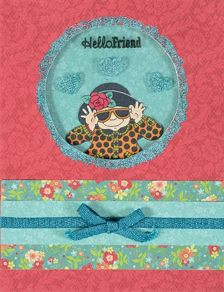 Use the VersaMark™ marker to draw around the card front window. Sprinkle with WOW embossing glitter, and heat set. Glue a 2”x5” Pretty Little Posies multi-color floral paper on the card ½” from the bottom. Glue a length of teal metallic ribbon across the center of a 1”x5” Pretty Little Posies teal floral paper and glue the ends to the back. Glue the teal floral paper centered on the multi-colored floral paper. Tie a teal metallic bow and Zot™ onto the ribbon center.