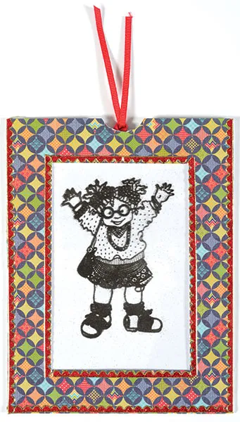 Slip the hinged piece inside the pocket, sliding the inner cardstock in between the colored image, and the acetate image. The image viewed on the front will be black and white. Place Red Jewel Border Dazzles™ around the card front edges as shown. If your acetate has a hard time sliding past the frame edge, slip a small 1/8” square of foam tape under the bottom frame section as far down as you can put it. This will lift the frame edge a bit so the acetate can slide under.