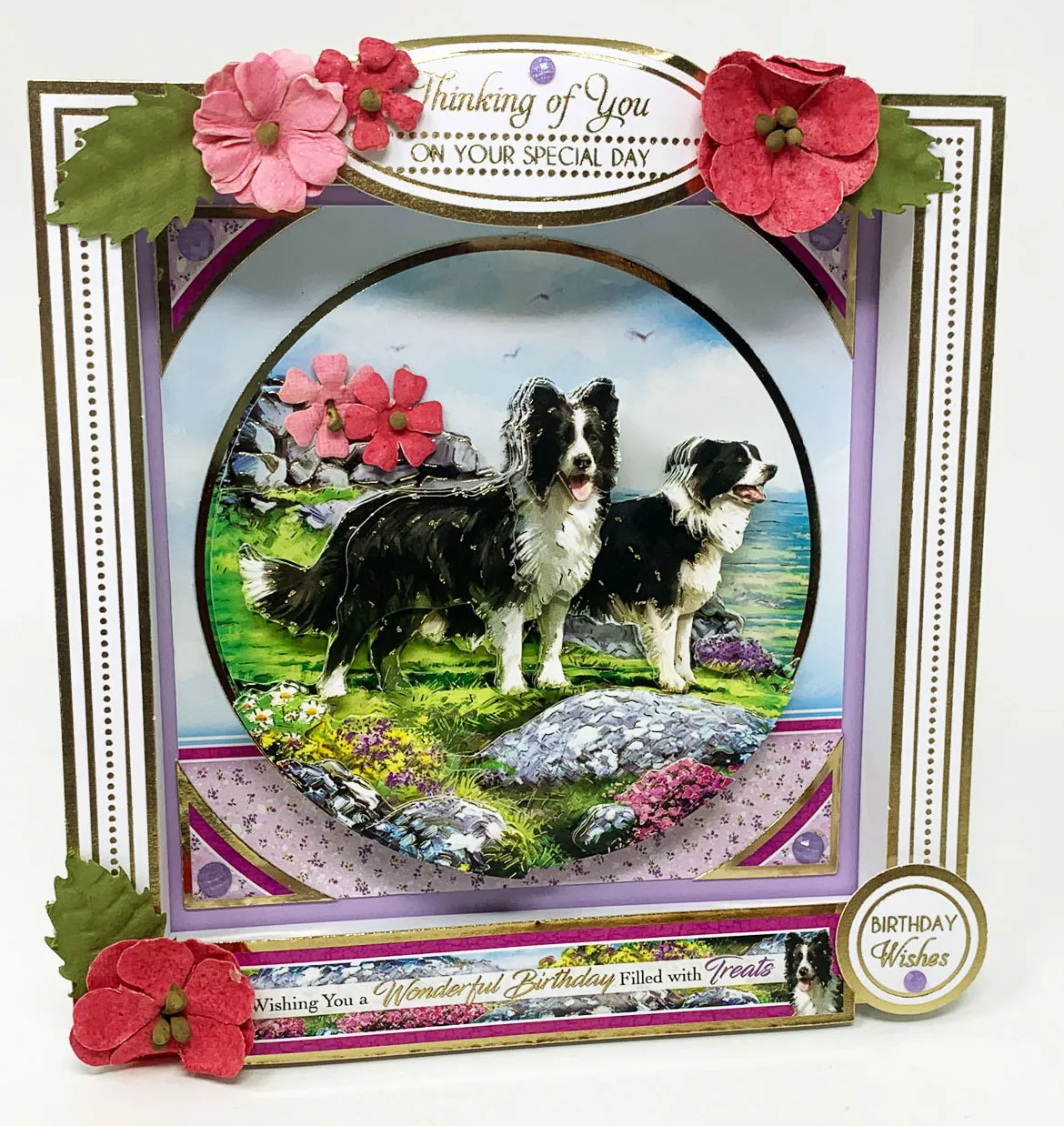 Cut 6 1/8” square of the Border Collie Insert and glue inside the box lid leaving a 1/8” white border. Glue the Happy Birthday circle topper as shown. Cut 6 ¼” tall piece from the other side of the insert and glue to the bottom. Glue “With Love” topper from the Box Frame kit into the center. When the card is complete it will fit into this box.