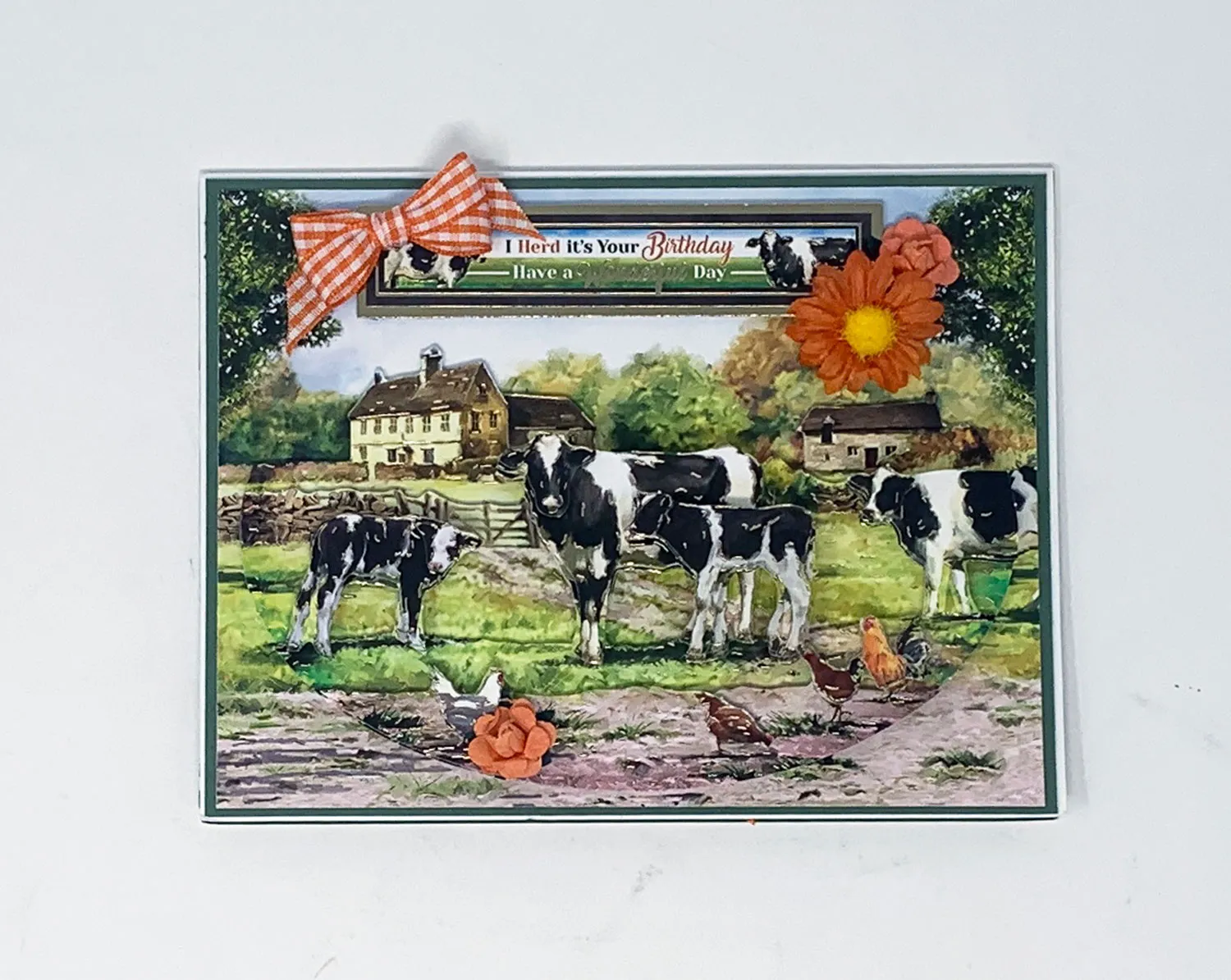 Card front: Cut 6.25”x4.75” of the printed cow Adorable Scorable (you just cut off the borders of this sheet), be sure to match the area of the largest image on The Farmyard Deco-Large sheet (it’s at the top). Mat on dark green Adorable Scorable with 1/8” borders. Glue to the card leaving a 1/16” white border.