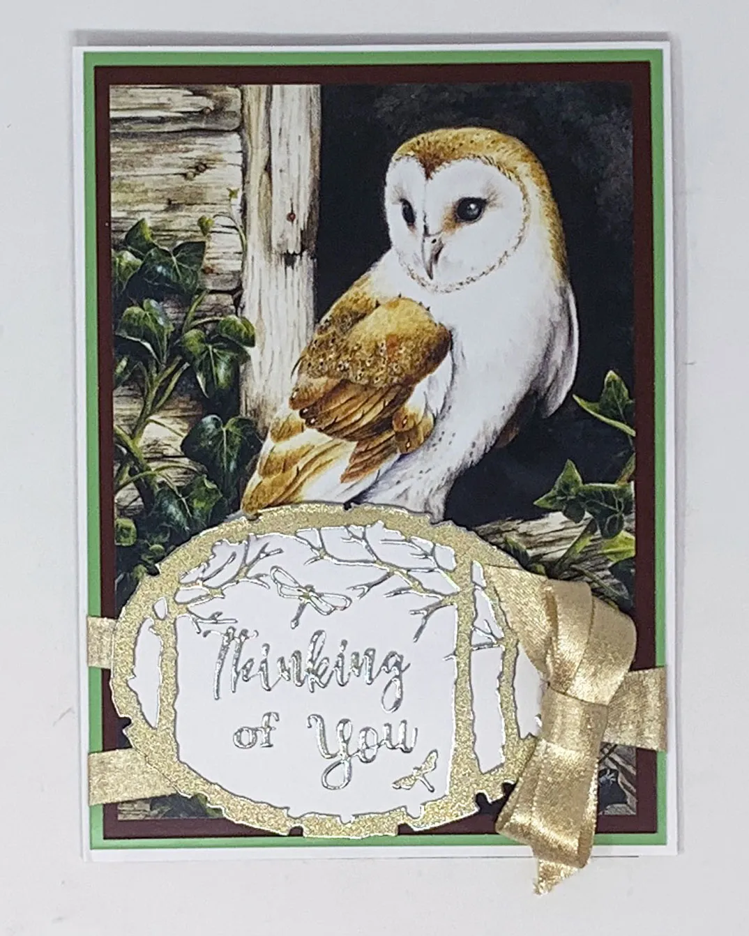 Trim 1/4” off the long opening side of the card (through both layers). Mat the vertical owl image from Little Book onto brown Adorable Scorable and leave 1/8” brown border. Mat again on light green Adorable Scorable and leave a 1/8” green border. Wrap gold ribbons along the bottom, crossing 1” from the right side and glue the ends to the back. Glue the piece to front leaving a 1/16” white border. Place the oval Dazzles™ on white cardstock (can use the back of the Adorable Scorable) and cut next to the Dazzles™ edge. Foam tape to the card and place the greeting and small Dazzles™ as shown. Zot™ a 2” wide gold bow to the right.