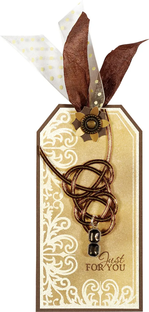 Punch a petal set from gold paper and brown cardstock and assemble a flower. Insert a brad through the flower and the tag hole and secure. Stamp "just for you" as shown. Use tape to secure the Mizuhiki knot to the tag as shown and trim the cord ends at the tag edges. Mat the tag on brown cardstock with 1/16" borders. Attach a dangle to the knot with the jump ring.