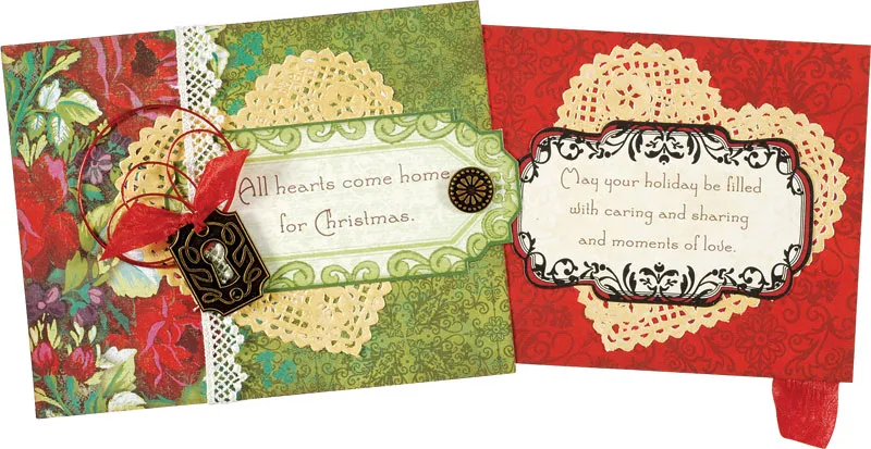 For the inside. Cut a 5½"x4½" cardstock. Fold a 3" ribbon in half and glue the ends to the cardstock at the lower right. Cover with Christmas red paper and ink the edges brown. Ink a doily gold and glue angled near the right edge. Print the sentiment on a red label and glue over the doily, 5/8" from the right edge. Place the cardstock inside the card with the ribbon loop at the upper left and centered along the right edge. Close the card and punch a hole through all the layers, centered on the right side, 3/8" from the edge. Insert the brad to secure. Check placement by pulling up on the ribbon loop to bring the inner card so it’s right side up beside the outer card. Tape the left edges of the outer card together.