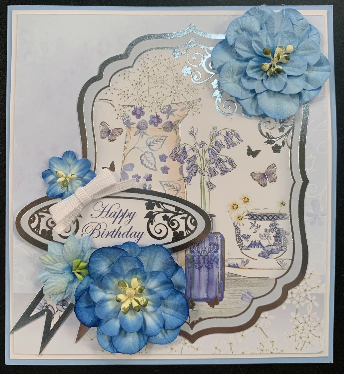 Card Front: Trim Matt-tastic Adorable Scorable to 11”x6” and score then fold at 5 1/2”. Use a bone folder for a crisp fold. From the matching foiled cardstock cut 5 1/8”x5 5/8” beginning at the far right side. Mat on white Matt-Tastic Adorable Scorable leaving 1/8” border. Glue to the card leaving a 1/16” border. Glue the foiled Topper as shown with the ends of the foiled border at the lower left. Foam tape Happy Birthday as shown. Glue the flowers and Zot™ a White bow as shown.