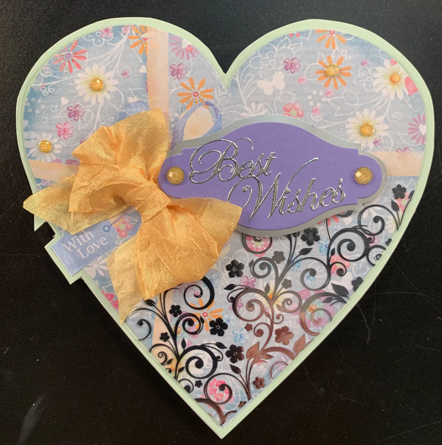 Card front: Place the point of the corner Luxury Foiled Acetate onto the large heart from the 6”x6” Pad. Use Cosmic Shimmer Specialist Acrylic Glue or the Glue Stick on top of the larger areas of the large heart and the large daisies. Mat the large heart and acetate on green Matt-tastic Adorable Scorable leaving a 1/8” border. Die cut the label from purple Matt-tastic Adorable Scorable and mat on silver paper with 1/8” border. Foam tape to the heart and add Dazzles™. Zot™ 2” wide bow and add gemstones as shown. Glue the heart to a blank card then trim to fit the shape.