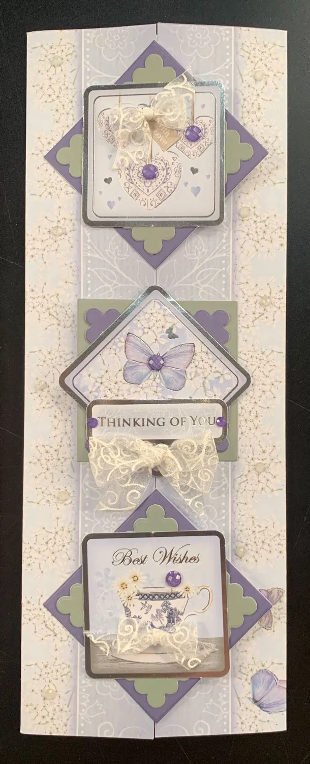 Card front: Cut printed Adorable Scorable to 11” long—be sure not to cut off the butterflies. To create the gate, score each side 2” from the outside and fold well with a bone folder. Die cut 2 purple squares and one green using the die set. Cut the corresponding scalloped squares 1 purple and 2 green. Glue the squares as shown. Glue square foiled die-cuts from the Luxury Card Kit to the centers of the squares. Glue the top and bottom squares on the left half of the gate on point and the center to the right gate. Round the foiled sentiment and glue a double foam layer in the center then attach along the bottom of center square. Zot™ 1” wide bows and place gemstones as shown.