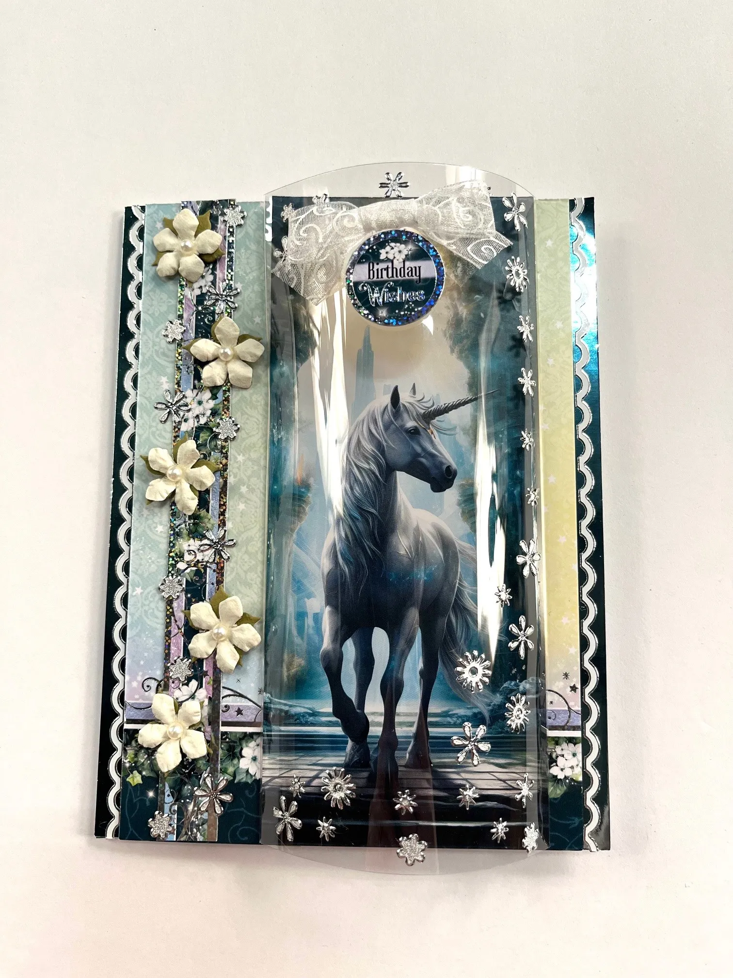 Inside: Cut teal Mirri into two 1 1/2"x6 ½” strips and glue to each side of the card base. Cut 3 3/4"x6 ½” of the remaining foiled Adorable Scoreable and glue to the center. Glue two pieces of the Unicorn Topper 1/4" from top and right side. Place white border Dazzles™️ on the sides as shown. Foam tape "With the New Day Comes" Topper in the lower left corner. Make and Zot™️ a 2" white bow on top. Foam tape "Have a Magical Day" Topper in the top right corner. Zot™️ a 1 1/2" white knot on top. Glue flowers and place Dazzles™ flowers as shown.