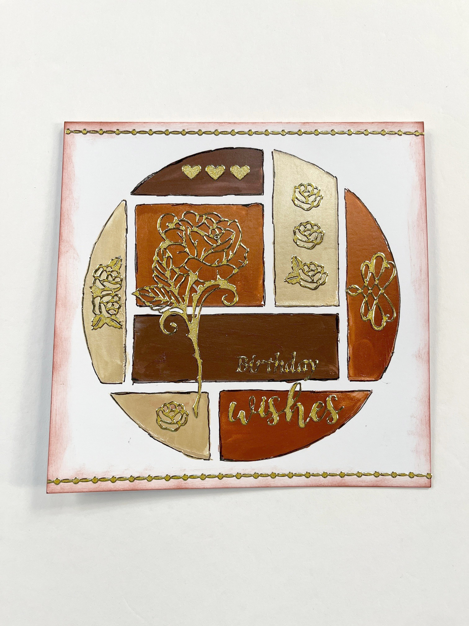 Ink card edges with cocoa bean ink. Tape stencil to card center. I used my fingertip to apply Stencil Butters to each stencil section because using a paintbrush leaves streaks and the palette knife applies too thick of a layer of Butter.