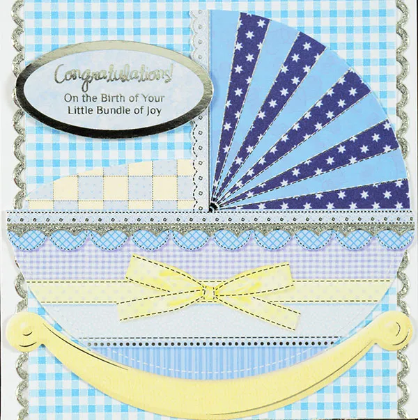 Card Front: Cut the card to 5” square and place the card with the fold on the left. Glue 4½”x5” blue gingham Sew Cute Paper down the card center. Place lengths of Silver Jewel Border Dazzles™ on each side of the gingham paper.