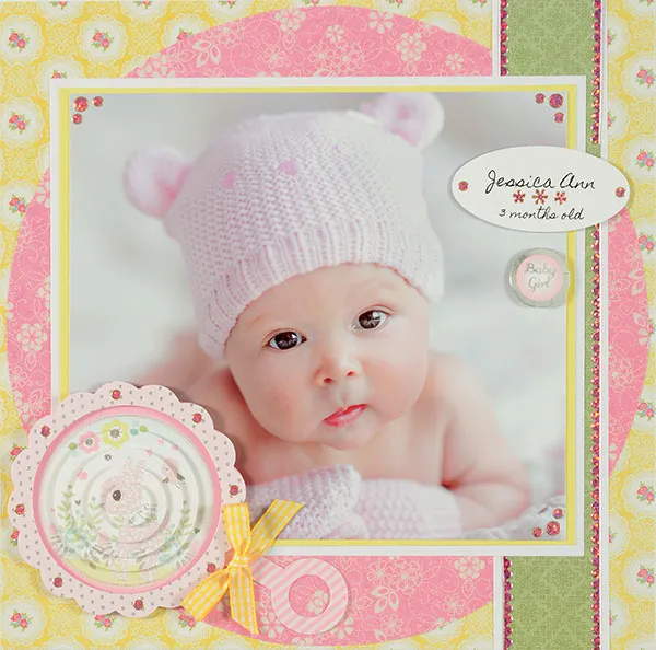 Background: Cut the Sew Cute yellow doily paper to 11¾” square and glue to 12”x12” white cardstock. Trace 11½” Easy Circles Template on Sew Cute pink floral paper, cut out and glue to the center of the page. Mat long edges of 1 3/4”x12” green Sew Cute green paper with white cardstock, leaving ¼” borders. Glue down the page, 7/8” from the right edge. Place lengths of Pink Jewel Border Dazzles™ along the long edges of the green border as shown.