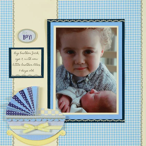 Write or print the names and ages on ivory cardstock. Cut to 2½”x2¼” and place a length of Silver Jewel Border Dazzles™ along the bottom edge. Mat with Lapis Lazuli Glimmer Paper, leaving ¼” border. Glue the journaling overlapping the left gingham border as shown. Foam tape “It’s a boy!” oval die-cut above the journaling.
