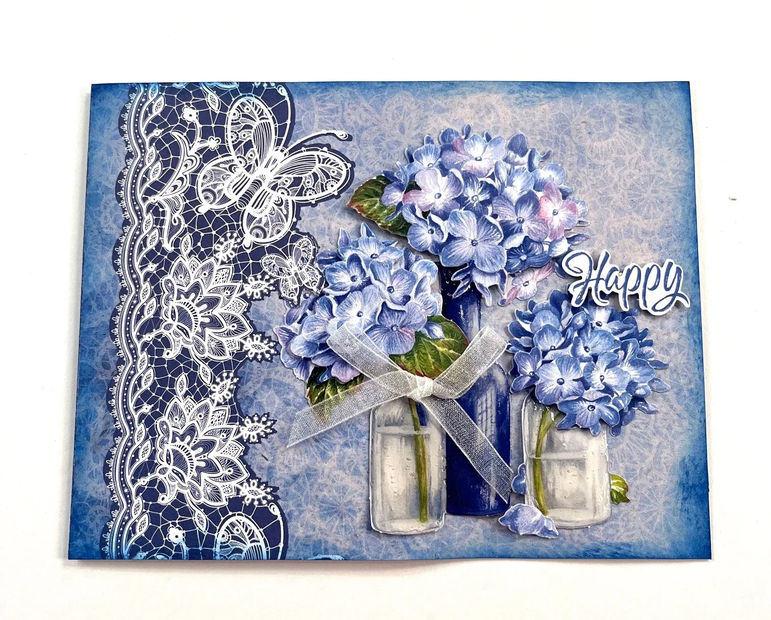 3. Remove the #2 large blue hydrangea die-cut images. Gently squeeze crystal lacquer over the bottle images; let dry.