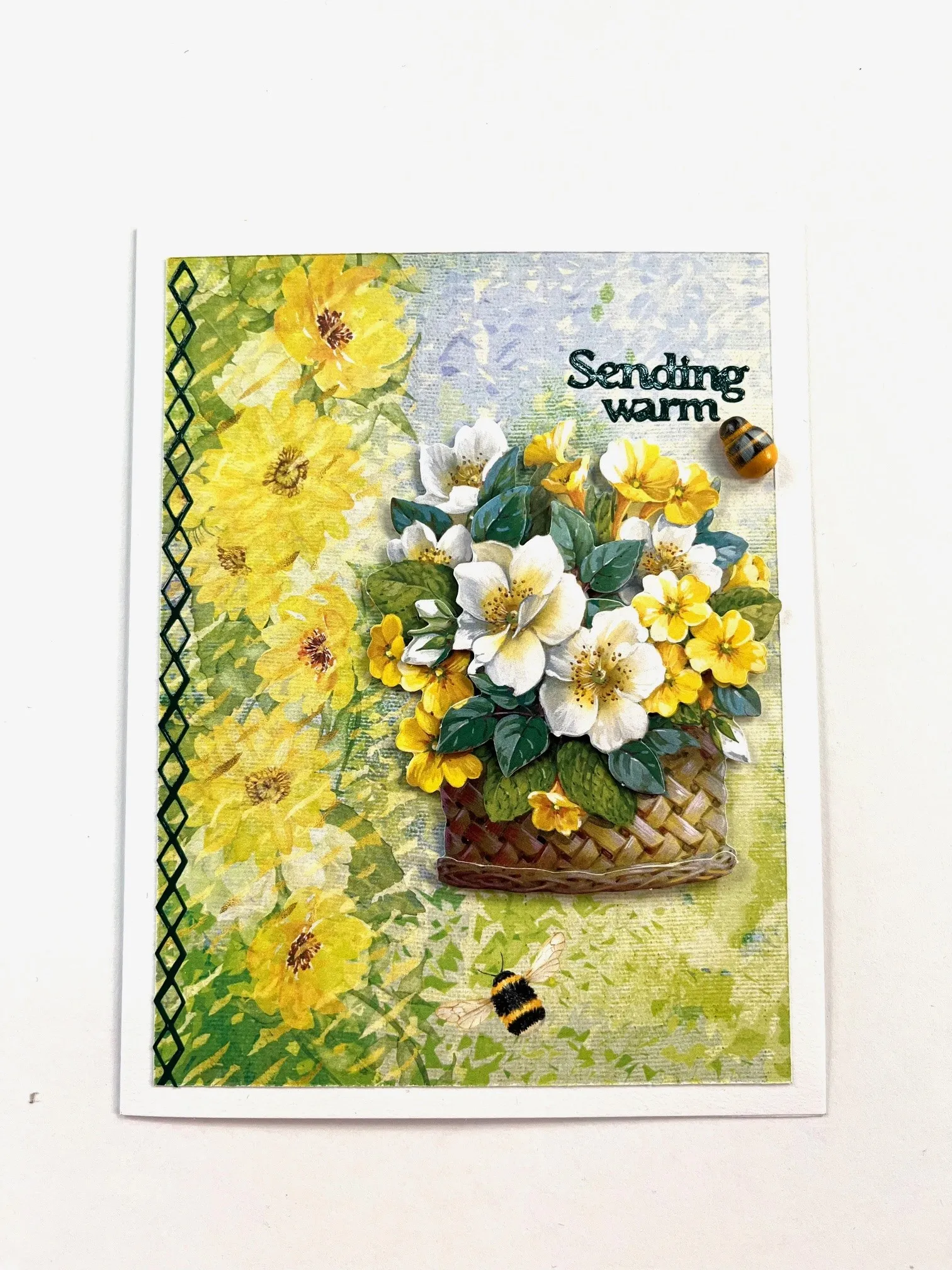 1. Cut 4”x6” green Bee Happy 12x12 Patterned Cardstock and glue to a card front. Foam tape C1 image on the right of the border. Foam tape C2 and C3 images over the matching art.
