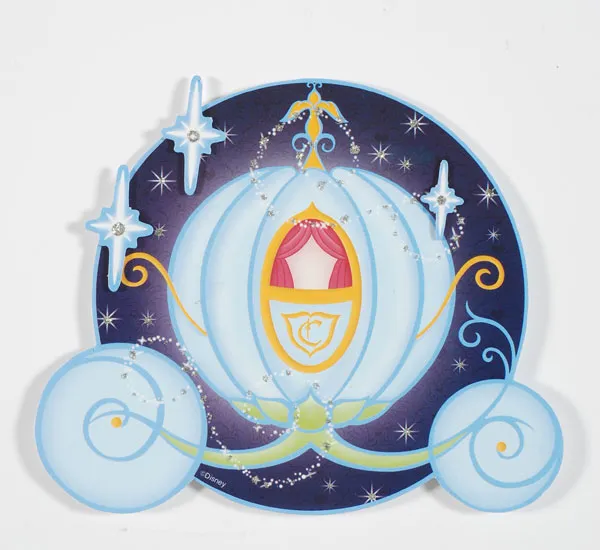 Center the 6”x6” Disney Princess light blue paper on the card inside back. Close the card and cut around the coach, keeping the fold below the wheel intact.