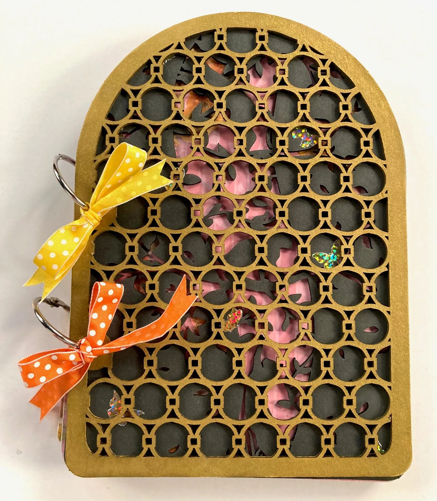 14. Finishing: Stack the pages in order and secure them with the binder rings. Tie a dots ribbon bow onto each ring on the front. Add a personal message in the open space on the back.