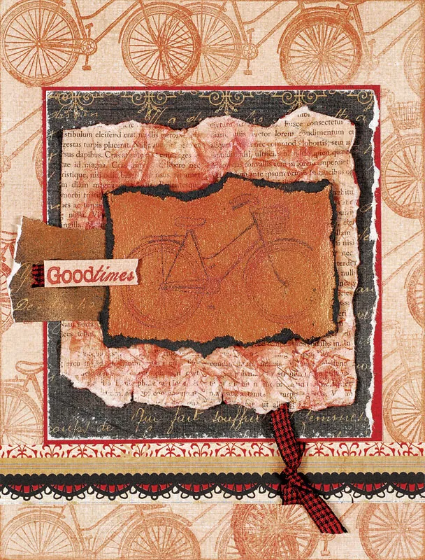Stamp “Goodtimes” on tan textured paper with VersaMark ink, then use the small brush to add red Perfect Pearls to the image. Mist with water to set and let dry. Foam tape overlapping the left of the bicycle image with a small piece of red/black checked ribbon as shown.