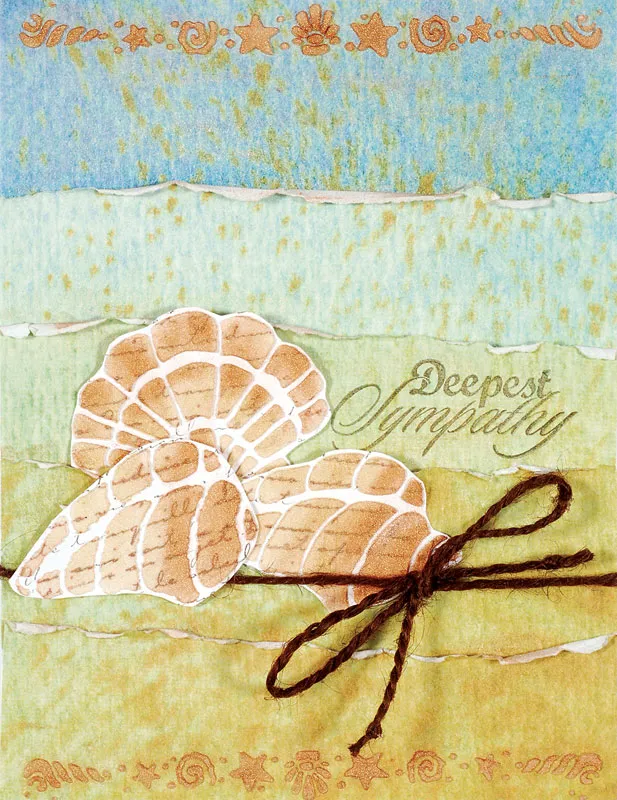 Inside: Cover the card inside back. Stamp a greeting to the card bottom right. Glue a shell to the left and glue a jute bow to the bottom right of the shell.