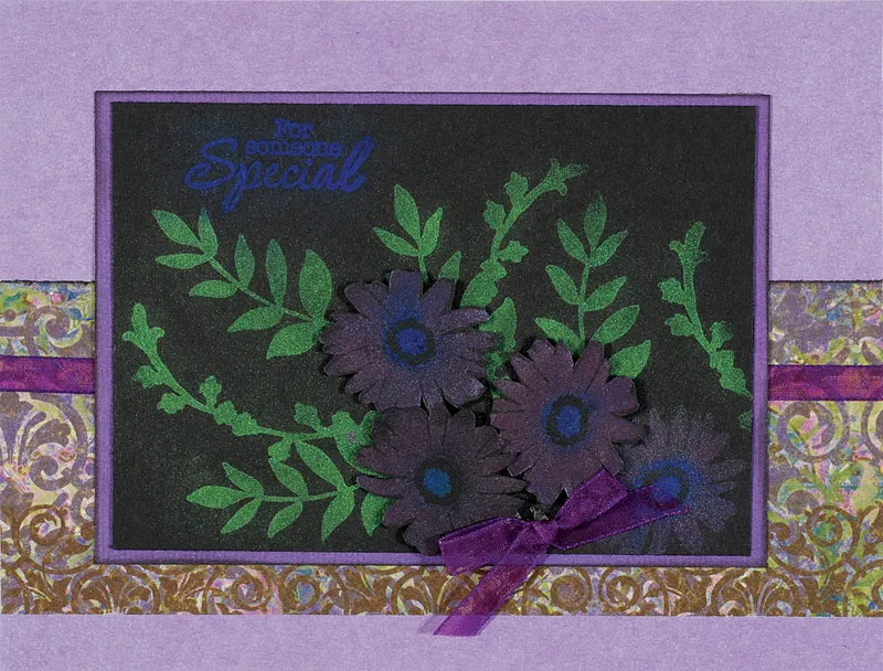Stamp 4 daisies on black cardstock and brush with blue/purple. Cut out each blossom. Foam tape 3 over the green stems to the left of the first flower. Foam tape a purple bow below the flowers.