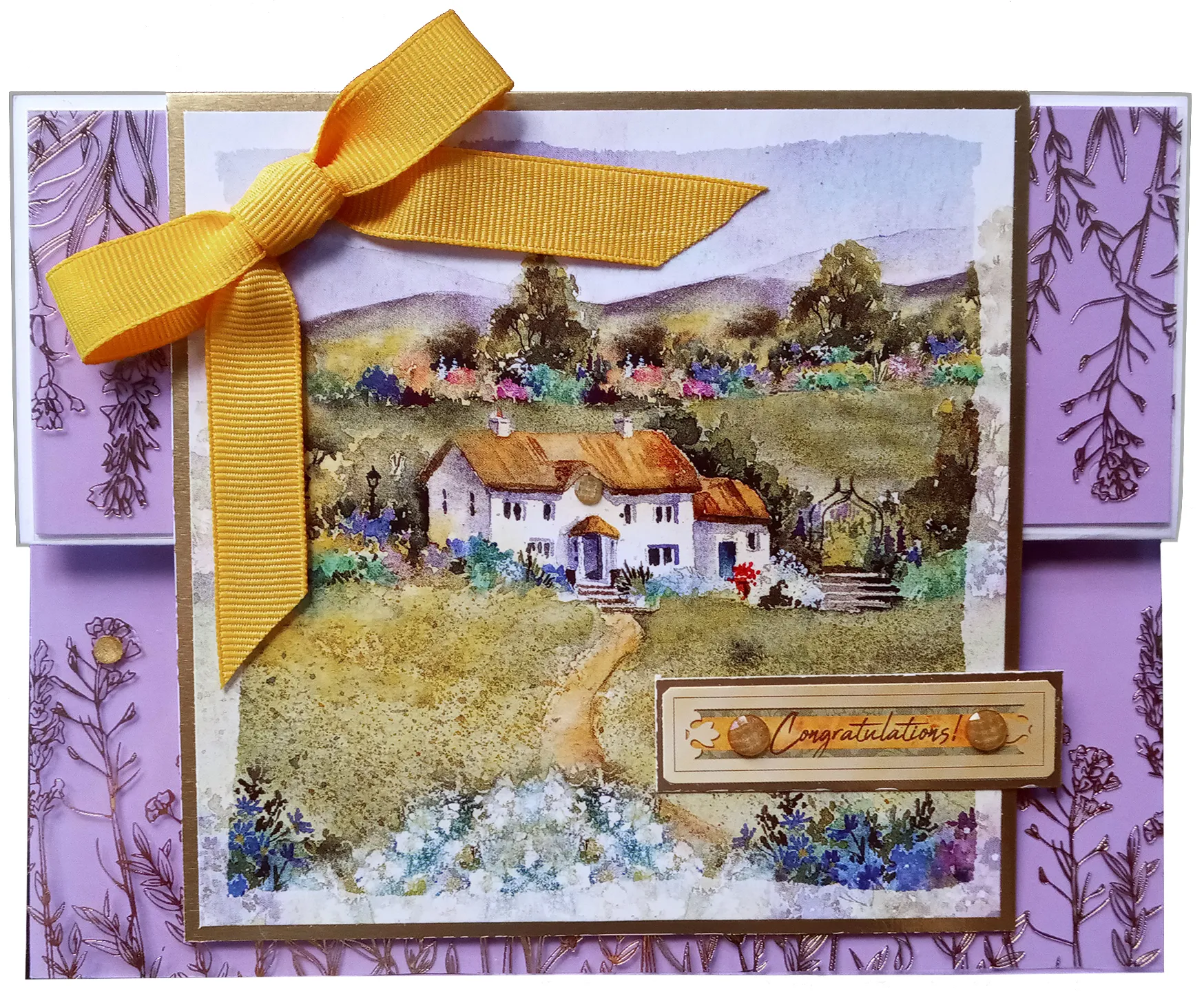 Cover the card inside with glue, position lavender Adorable Scorable along the fold and even with the card top. Trim to fit. Cut Foiled Acetate to the same size. Place Zot™ of glue behind some of flowers and place on the card. Select the smaller cottage image from The Little Book and cut to be 2" square. Mat on gold cardstock with 1/16" gold border. Foam tape to the card. The card front will rest here when open. Cut out the "New Home" sentiment and mat on the gold cardstock with a 1/16" gold border. Glue above the raised image with a 1 ½" bow Zotted™ below it. Place the Diamond Sparkles as shown.