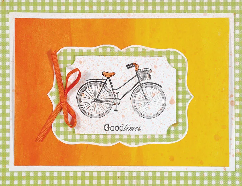 Drag a wet liner paintbrush across the dark orange Gelato and paint the seat and handle bars orange. Let dry. Foam tape the bike label to a Green Gingham Designer Label (2 3/4”x4”) matted with white cardstock, leaving a 1/8” border. Glue the label to the card front and mist the entire card orange. Glue an orange bow to the left side of the bike label.