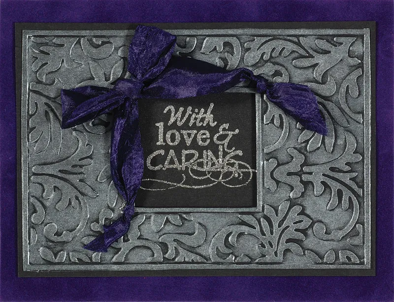 Mat the frame with black cardstock, leaving a 1/8” wide border. Use the penknife to cutaway the black from the window area. Place the card fold at the top. Cover the card with suede paper. Glue the frame to the card front. Open the card and lay flat. Use the knife to cut away the violet suede from the window.