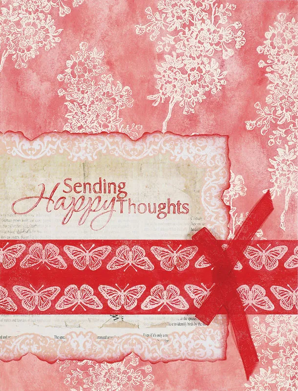 Place the “Sending Happy Thoughts” stamp on an acrylic block. Color in with Red Cherry Gelato, covering the stamp in small circular motions. Spritz the stamp with water, then stamp onto the top right of the journaling note card. Glue the note card 1” from the right and 1/2” from the bottom. Trim off excess.