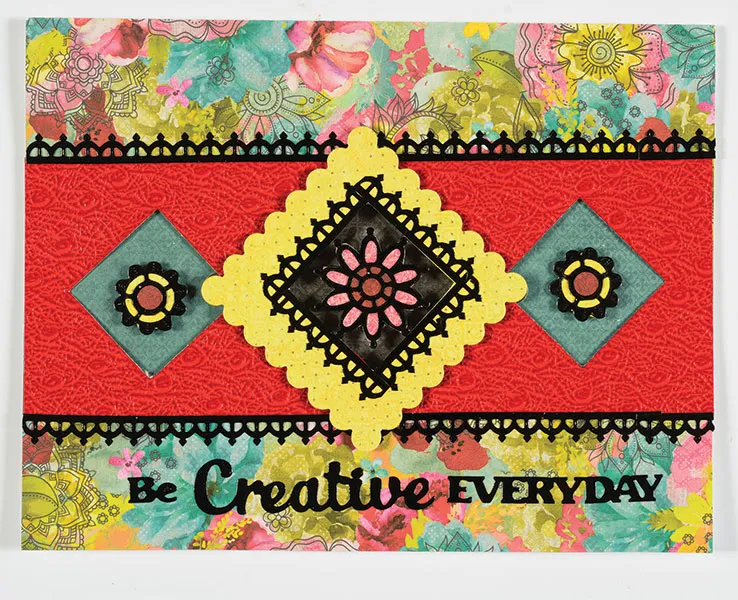Card front: Place a blank card with the fold on top. Cover with Paper Painting multi-color floral paper. Glue a 6½”x2½” red peacock paper centered. Place a border Dazzles™ on the top and bottom of the red peacock paper.