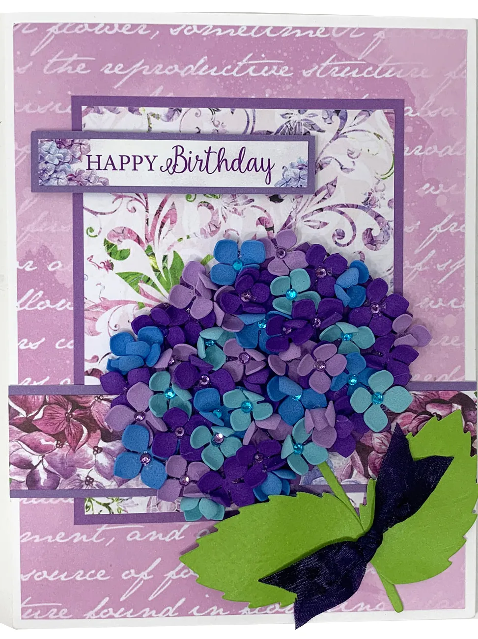 Die cut the large hydrangea base from dark purple cardstock. Use the specialist glue to attach the blossoms to the base, crowding them close together and alternating the colors. Place a rhinestone in the center of each blossom.