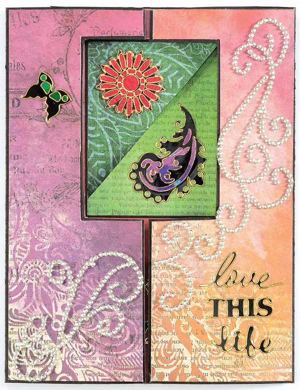 Cover the two side panels with Bohemian Dreams purple/orange border paper or cover the whole panel. Place the Inspire Swirl rhinestones diagonally from the bottom left corner to the top right corner. Place the word Dazzles™ on the right bottom corner. Back a small butterfly with green holographic paper, cut close to the Dazzles™ edge, and glue on the top left.