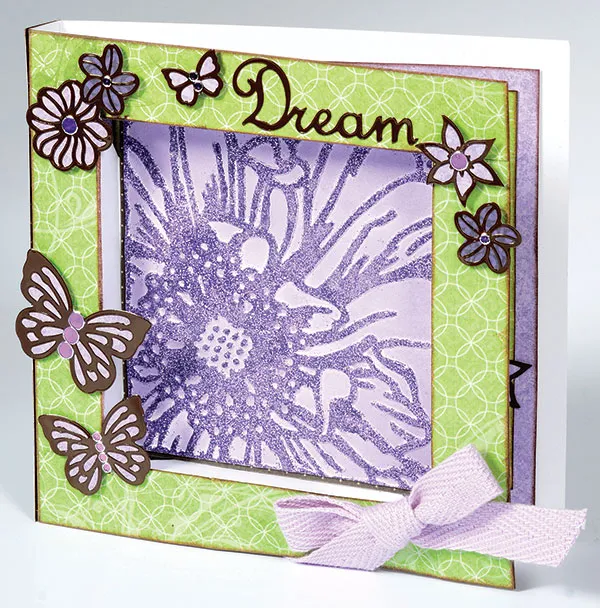 Cut 3/4" wide strips of Wildflowers green/ivory circles paper and glue 1 on each side of the 3-D frame, trimming edges evenly. Ink the inner and outer edges with dark brown ink. Back Wildflowers Dazzles™ butterflies and flowers with lavender or purple patterned paper and foam tape in place on the frame as shown. Add “Dream” as shown. Use 1/2" wide lavender twill to tie a bow. Zot™ the bow on the lower right edge of the frame. Add purple jewel Dazzles™ as shown.