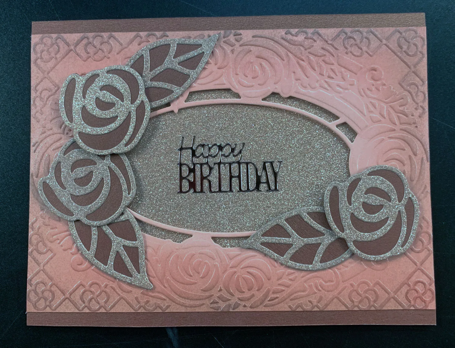 Die cut three small roses and three leaves from Rose Gold glitter cardstock. Glue all the die-cuts to brown shimmer cardstock and trim along the edges. Foam tape and glue the roses and leaves to the front as shown.