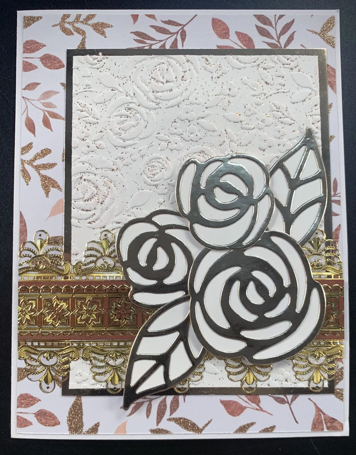 Die cut one large rose, two small roses, and two leaves from Rose Gold foil cardstock. Glue the die-cuts to white cardstock and trim along the edges. Glue and foam tape the die-cuts to the front as shown.