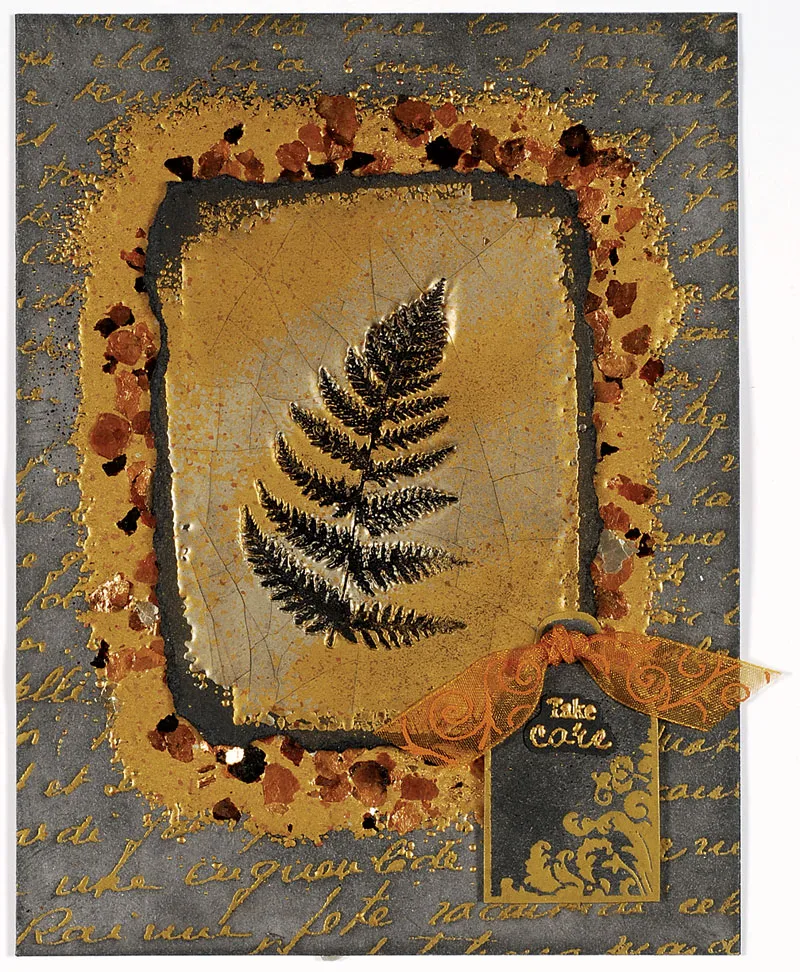 Draw a 3”x4” rectangle lightly in pencil in the center of the gold Color Me™ piece. Dab a clean cosmetic sponge onto your VersaMark™ ink pad and rub onto the piece over the pencil line, creating a soft frame (for the fern to rest on later). Pour on Aged Gold embossing enamel and sprinkle on some Tea Stained Mica Fragments. Heat emboss the enamel from the back of the paper (do NOT emboss or blow on the front; your fragments and enamel will fly everywhere). Keep the heat gun about 3-4” away from the back of the paper. After the embossing enamel melts, set aside to cool. Take your 5”x6 1/2” blank white card with the fold on the left and glue the piece covering the card front.