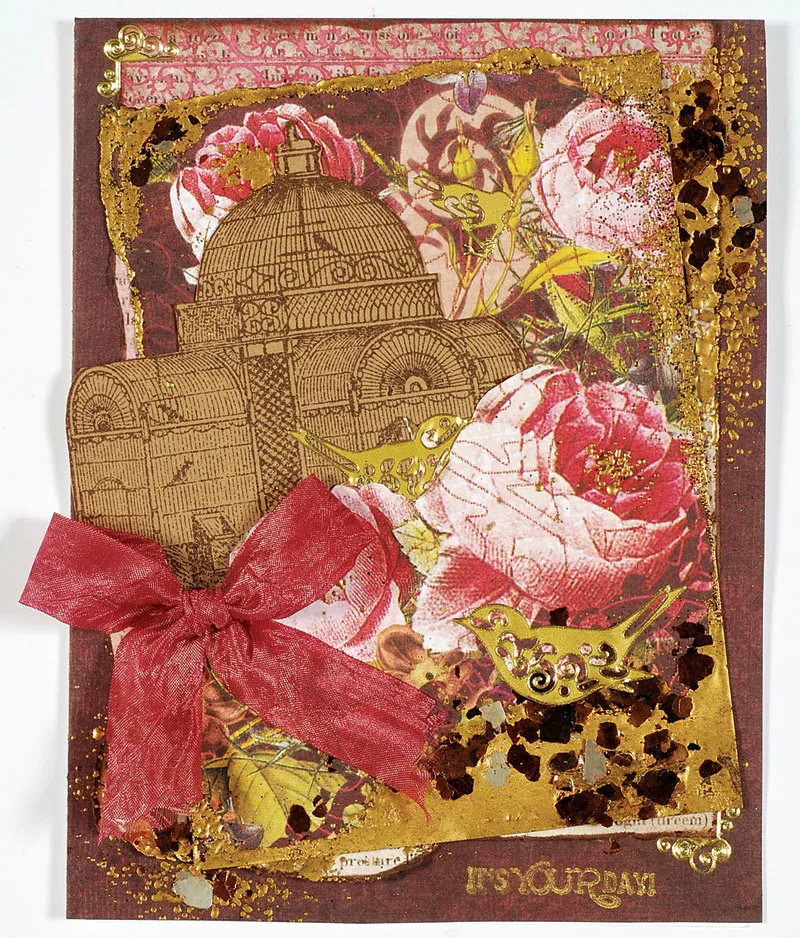 Place corner Dazzles at the top left and bottom right of the card. Place bird Dazzles among the roses, with larger birds at the front and smaller at the back. Glue a mauve bow to the lower left side of the card. Using gold ink, stamp a greeting at the bottom right corner.