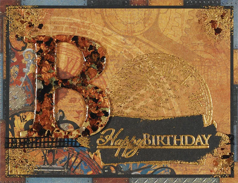 Emboss “Happy Birthday” on black cardstock and use the template to trace and cut out the label. Apply Versamark™ ink to the edges of the label and emboss with gold. Glue black ribbon across the card 1” from the bottom and glue the label over the top 1/2” from the bottom and 1/4” from the right. Foam tape the “B” to the left.