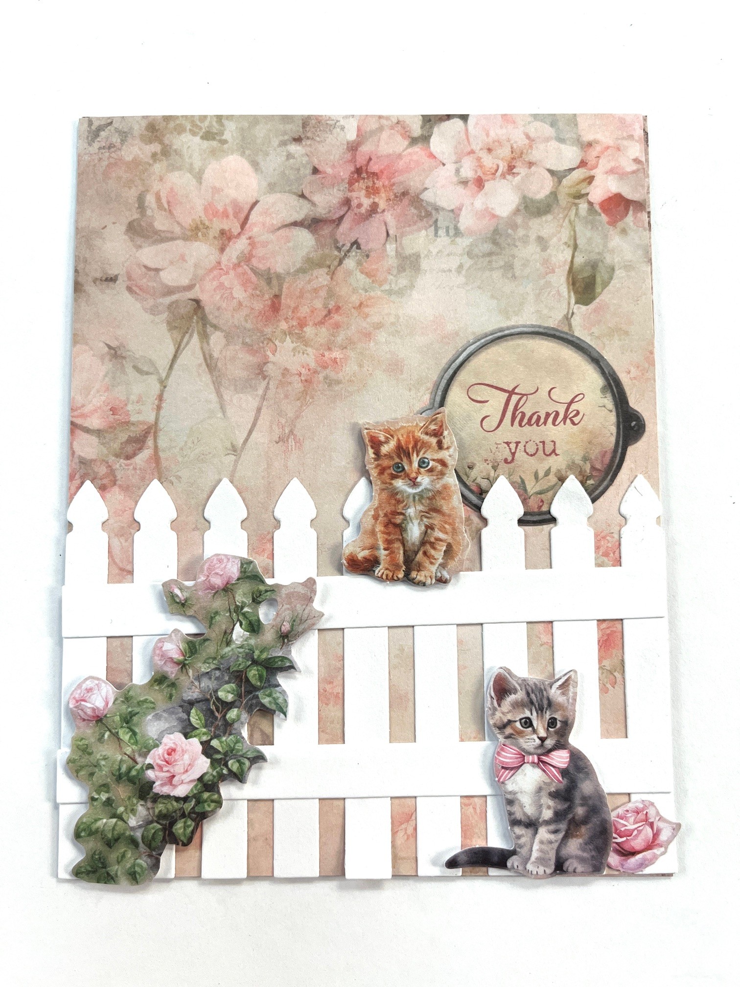 3. Remove the kitten die-cuts and foam tape as shown. Remove the stone wall with flowers climbing on it die-cut. Use the precision scissors to remove the wall and foam tape the flowers climbing the picket fence. Glue the “thank you” die-cut slipped under the fence.