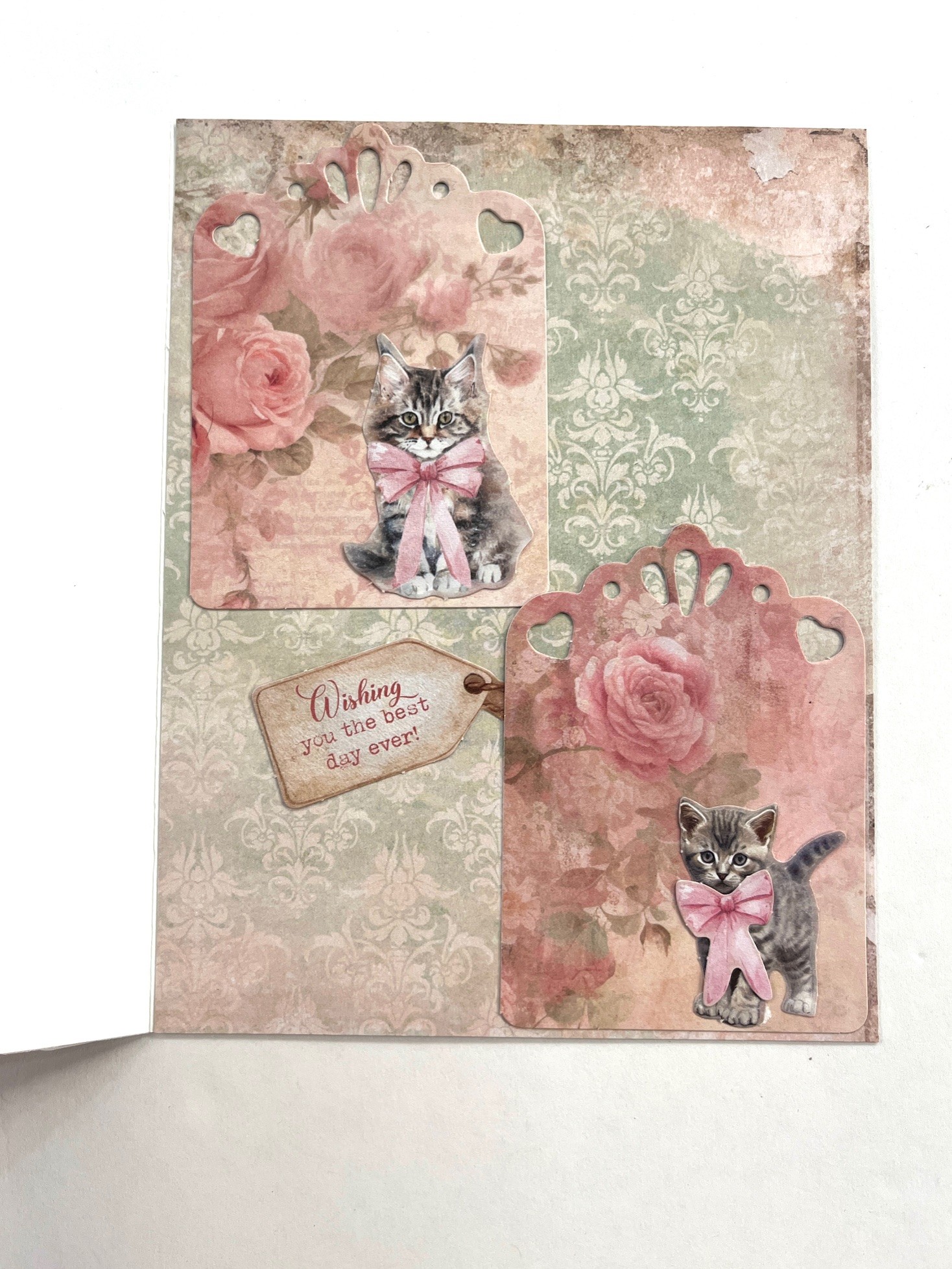 4. Inside: Cover with green/pink paper. Glue the tags as shown and glue the kittens at the bottom of each. Glue the pink bow die-cut on the gray kitten. Glue “Wishing. . .” die-cut slipped under the bottom tag.