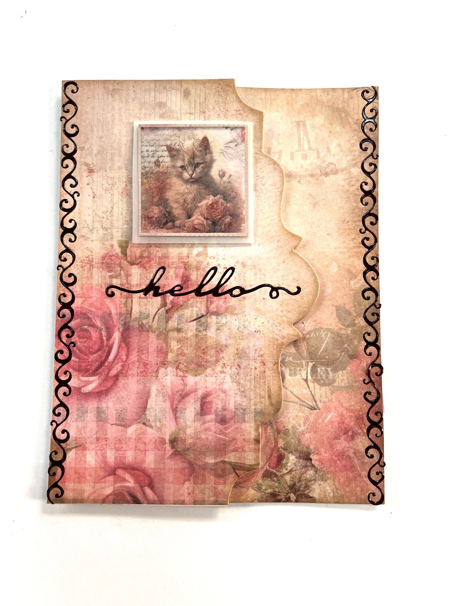 1. Select the A Cat’s Secret paper shown. Glue to the front of the card. Tape the largest Foldover die to cut 1” from the edge of the card. Fold the card in half and run through the die cutting machine.