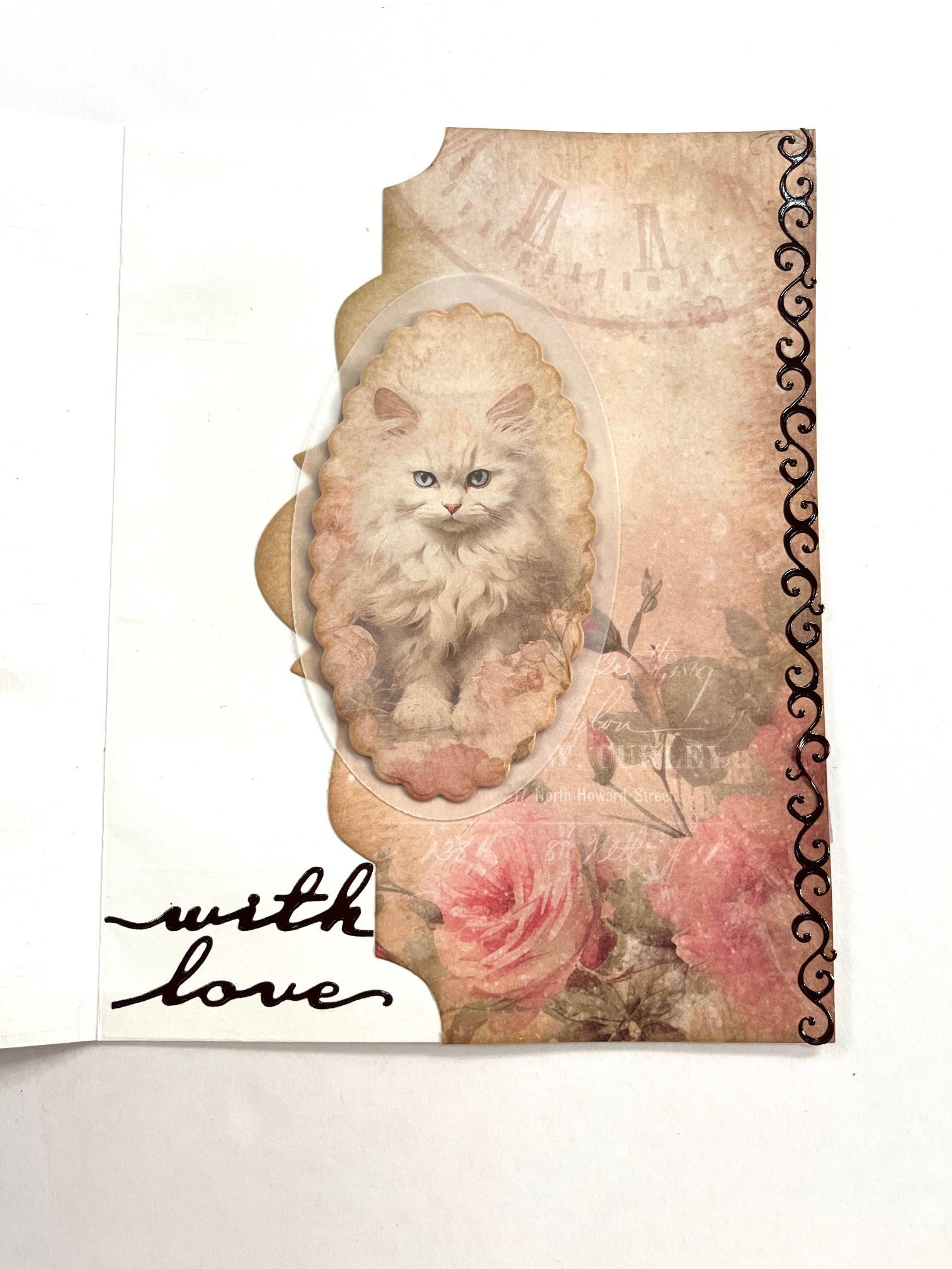 5. Use the Oval dies to cut out a white cat with 2” wide oval. Cut out a smooth oval from vellum. Ink the cat image edges and foam tape to the vellum. Glue the vellum as shown. Place “with love” brown script Dazzles™ as shown.