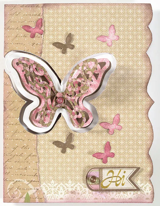 Valley fold the card in half and fold the the die cut shapes so they pivot to the front and back as shown. Place Design Tool Kit #2 scalloped edge along the right edge of the card front. Trace the shape and then cut through both layers of your card. Apply brown ink to the front and back of the card edges. Foam tape a Kindred Spirits Embellies™ tag to the front lower right corner. Place “Hi” Gold Greetings Dazzles™ on the tag. Die cut six tiny butterflies from mauve, brown, and pink Kindred Spirits papers and ink the edges brown. Glue to the card front as shown.