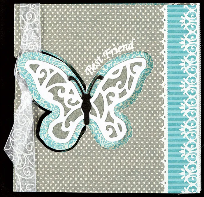 Fold the card in half and gently swivel the die cut shapes outward so they pivot to the card front and back as shown. Wrap a ½” wide length of Robin’s Red white swirly ribbon around the front of the card next to the fold and knot. Cut the ends to 1¼” long. Place “Best Friend” Family & Friends Dazzles™ along the top edge of the butterfly as shown.