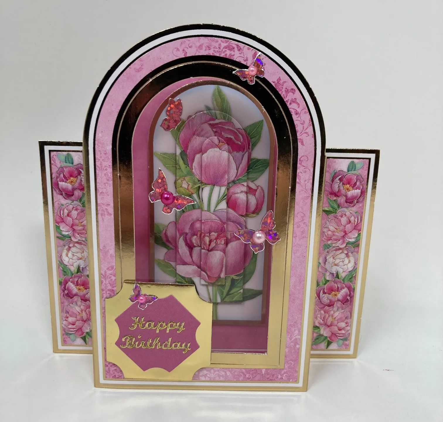 3. Die cut a 1½" square label from Mirri and foam tape it to the front at the lower left. Die cut a 1⅛" square label from pink cardstock and glue it to the gold label, offset as shown. Place gold “happy birthday” Dazzles™ on the pink label. Place four pink butterfly Dazzles™ on the front, then place pink pearls on the bodies as shown.