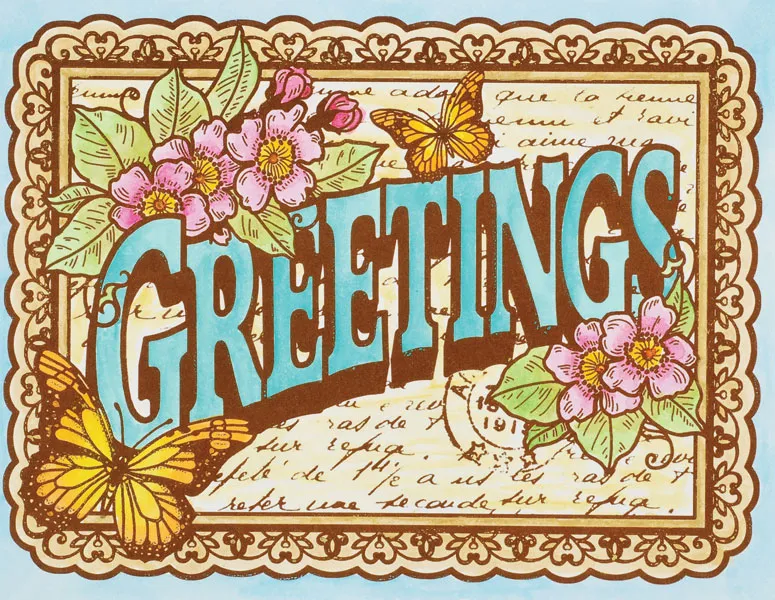 Card inside: Cut out the center of the postcard Card Topper and paint the flowers, center, leaves and butterfly as before. Glue to the center of your card. Cut out the “Wish you were…” label and paint with #154. Glue to the card center as shown.
