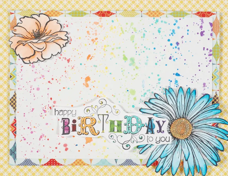 Cut a 5 1/2”x 4” white cardstock. Following the tip above to create splatters, make a rainbow pattern on your cardstock with #125, #121, #111, #105, #168, #147, #143, and #136. Mat on Happy Days multi colored paper with 1/4” borders and foam tape to the center of your card.