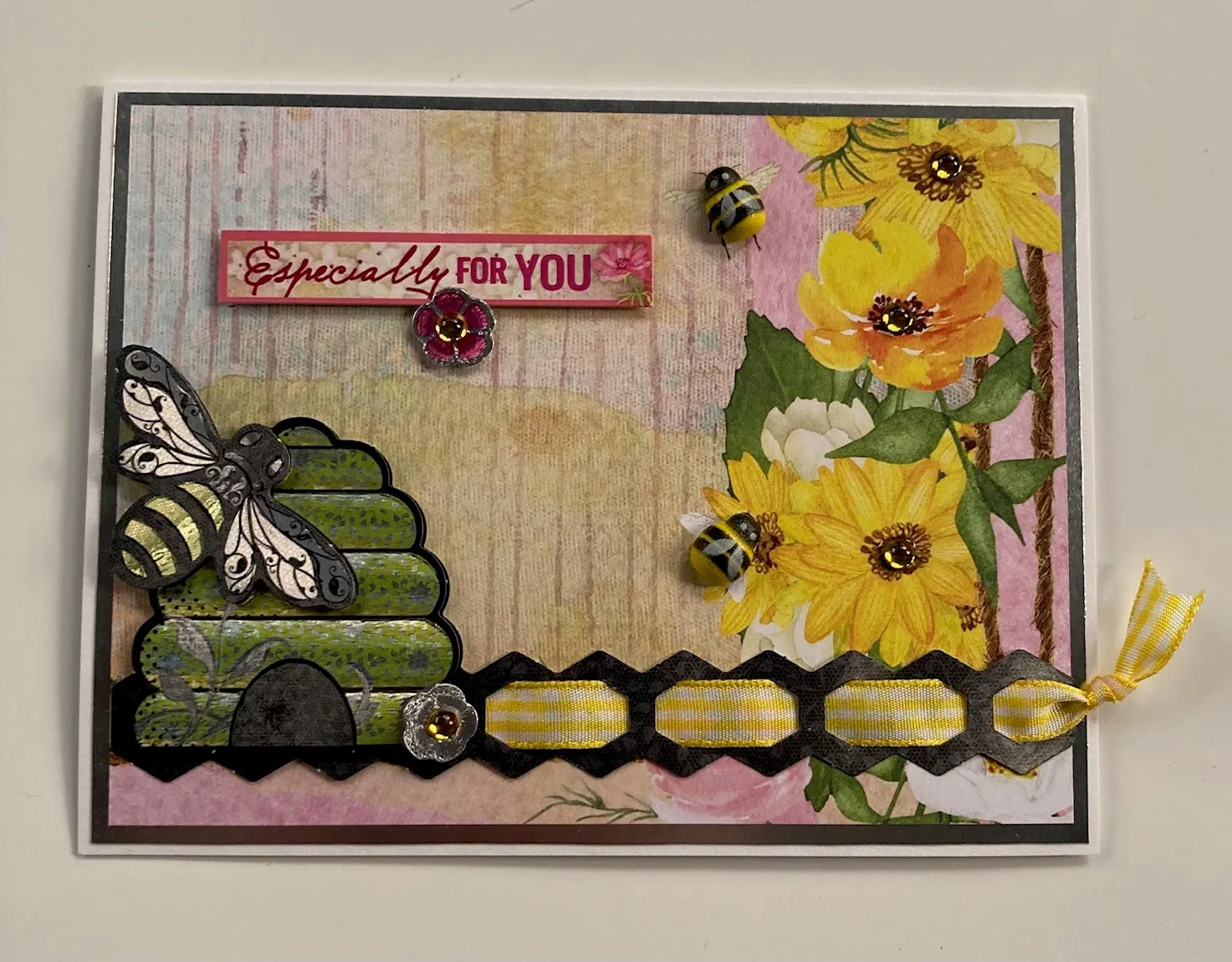 3. Foam tape the “especially for you” die-cut to the front above the hive, then foam tape an extra art paper tole flower below it as shown. Place two wooden bees on the printed bees in the flower border, then place crystals in the flower centers.
