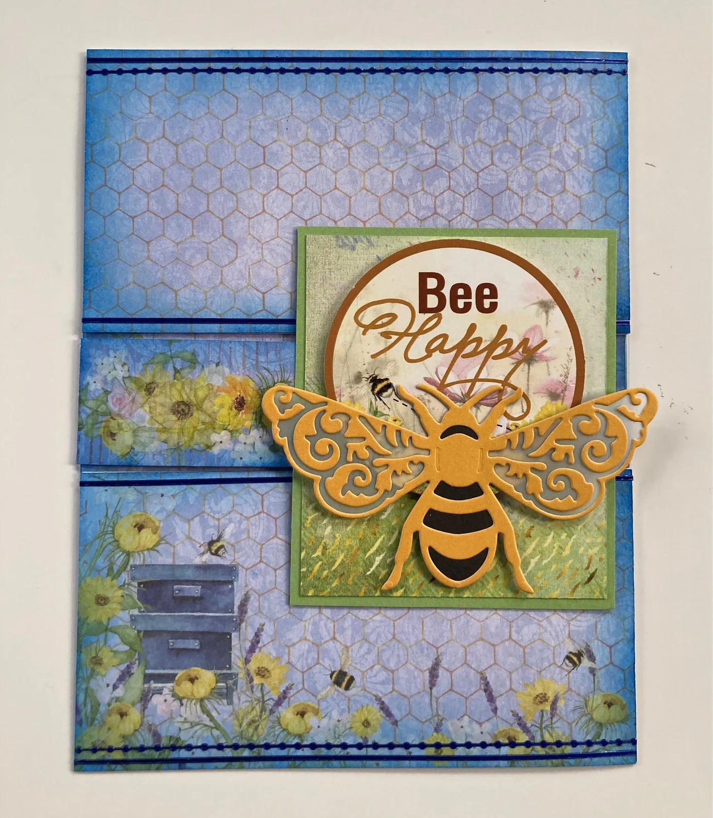 6. For the inside front: Open the strip. Cut out the Bee Happy “even busy bees…” large cutout and mat it on light green cardstock with 1/16" borders. Glue it to the front so it’s hidden behind the front bee embellishment when the strip is closed.