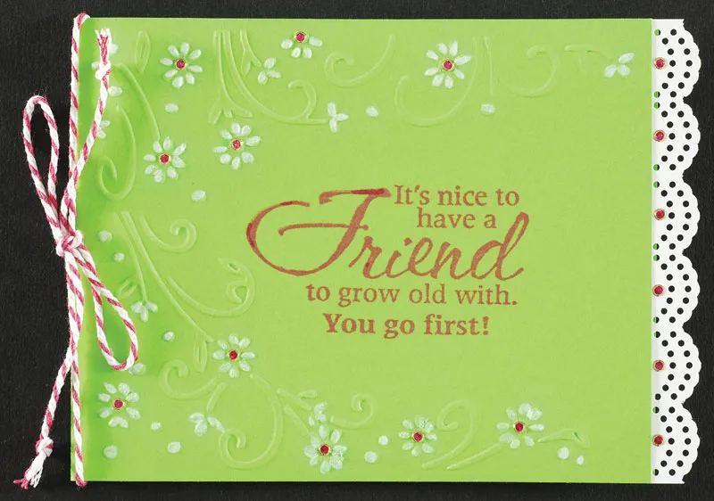 Stamp a greeting on pink at the center of the card. Use the Smooch™ to color the blossoms, buds and dots. Let dry. Place tiny Jewel Dazzles at the center of each flower and along the scalloped border. Tie a length of twine around the card fold into a bow. Knot the ends.